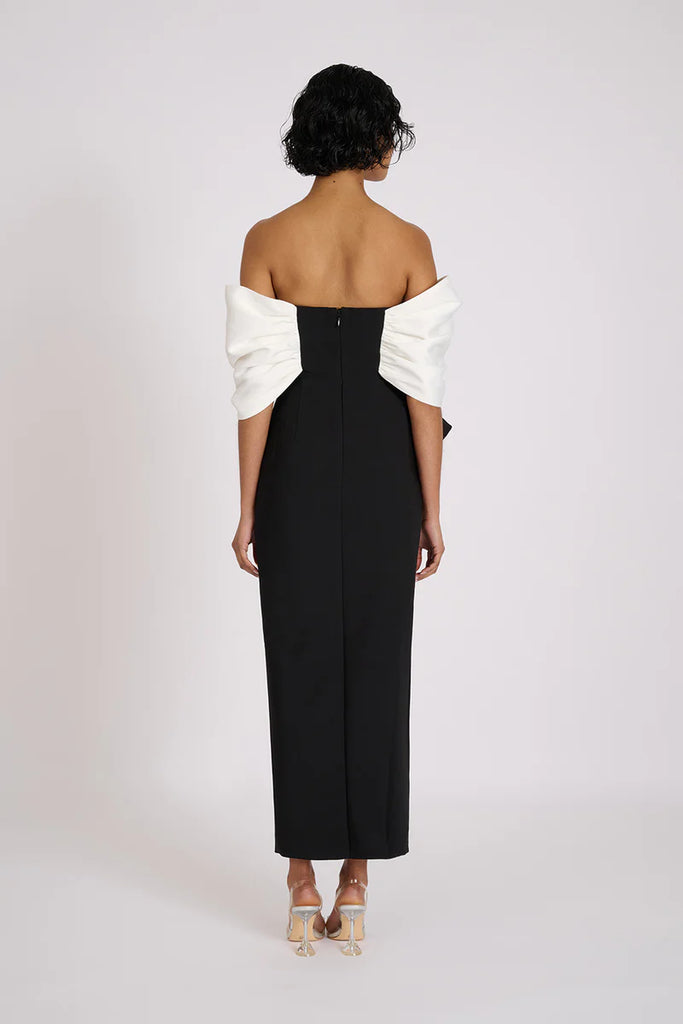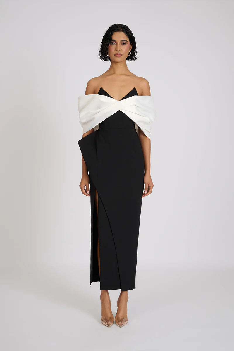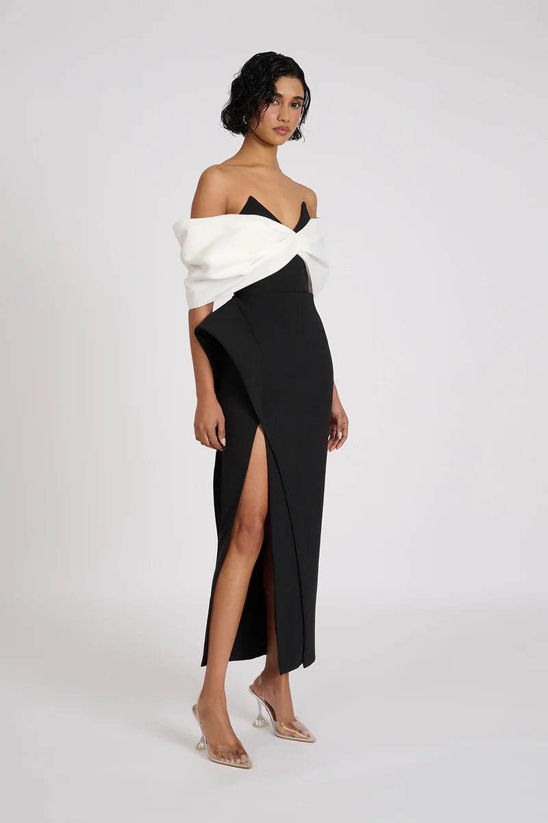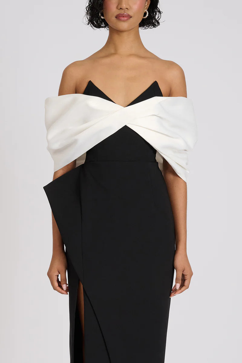 Introducing the Rowan Dress (fully lined) – a bold and elegant statement piece perfect for sophisticated occasions. This striking dress features a flattering strapless neckline, complemented by off-the-shoulder draped sleeves in contrasting white that beautifully contrasts with the sleek black bonded crepe base. The exaggerated pointed neckline adds a modern, high-fashion twist, while the boned bodice provides structure and support for a sculpted silhouette. Designed in a figure-hugging midi length, the Rowan Dress also boasts a daring split, offering a touch of allure and movement with every step.
