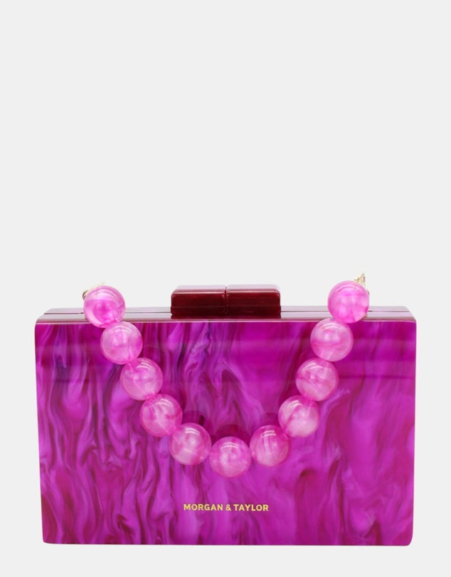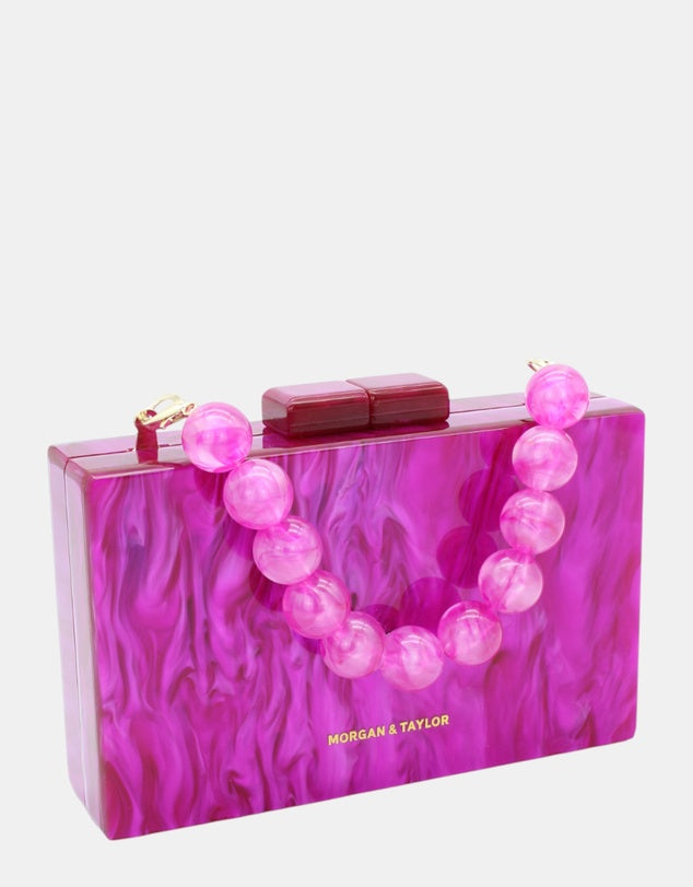 The Morgan and Taylor Arya Clutch in hot pink is a fun and modern statement style, perfect for adding a pop of colour to any look. The acrylic, rectangular shape features bold, tonal marbling, and is finished with a cute, pearl top handle. Finished with a simple press closure and includes a detachable chain for alternative styling.