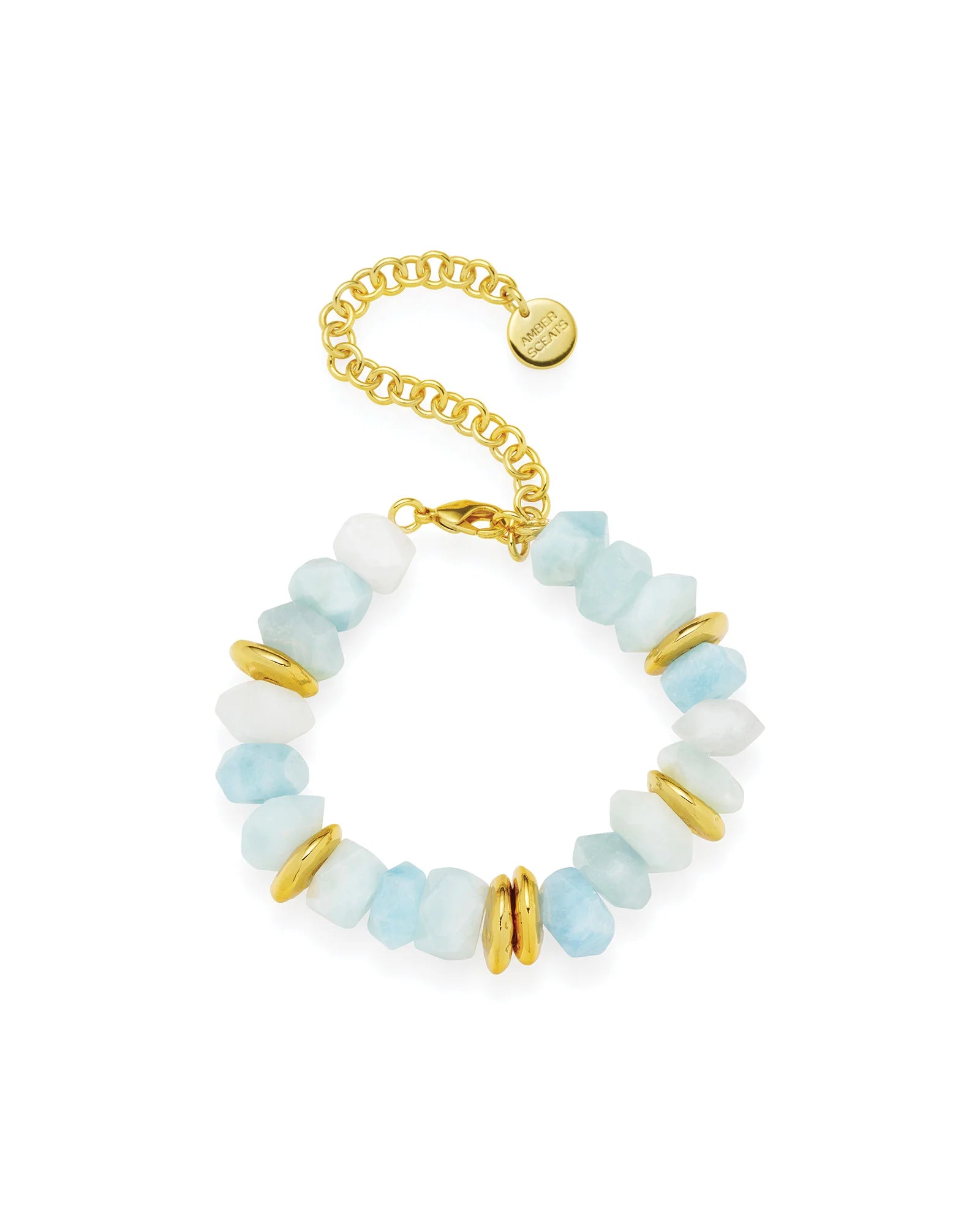 Inspired by iridescent European waters, the Saint Tropez Bracelet features semi-precious Aquarmarine stones and polished gold beads. Wear yours with the matching Saint Tropez Necklace. Genuine semi-precious materials, please allow for natural variances in stones. Each piece is one of a kind.