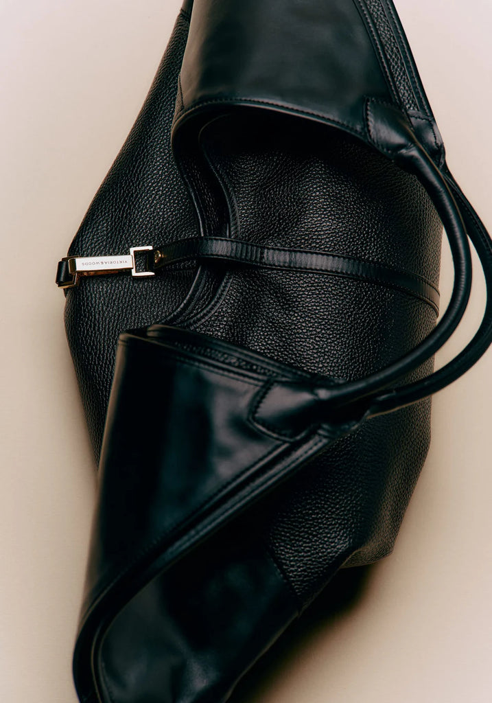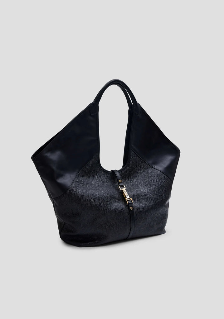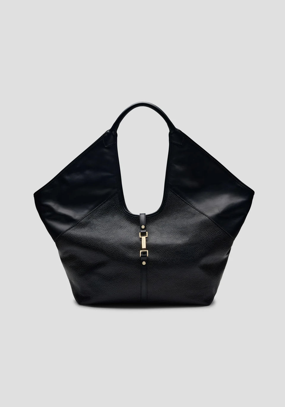 Complete your look with the Blake Bag, crafted from black pebbled leather. This large, trapezium-shaped bag features a branded strap clip and tubular shoulder straps. The must-have accessory of the season, perfect for both work and weekend wear.