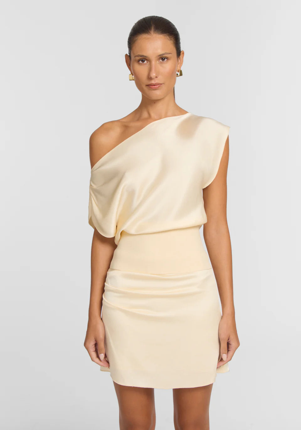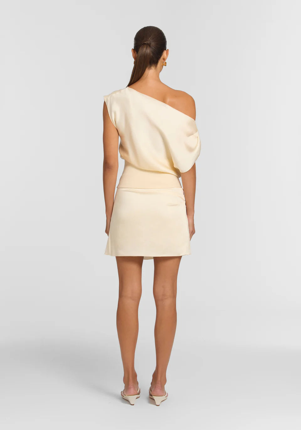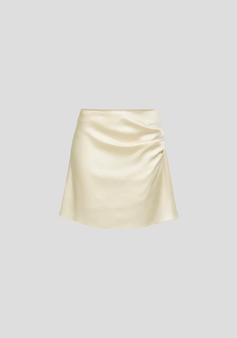 The Javier Skirt, crafted in a warm buttermilk hue, blends elegance with ease in a chic mini skirt silhouette. Featuring a mid-rise waist and delicate tucks along the left side for subtle dimension, it embodies refined simplicity. Style back with V&W essentials, or complete the look with the Mabel Top for a silky set that exudes considered elegance.